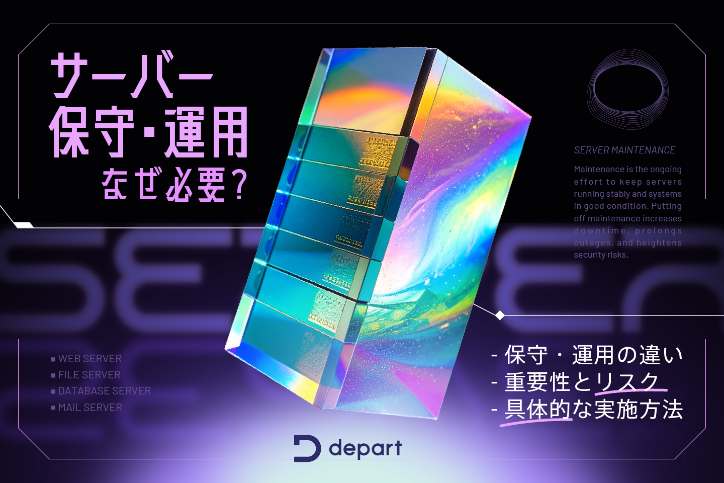 - Webサイトのリリース後に重要となる運用・運営において、運用効率を高め負荷を低減し効果を最大化にするために、サーバーやドメインの管理、セキュリティの確保、CMSのアップデート、コンテンツの更新など、体制の構築を含む運用設計のご提案から実務上の業務支援を提供します。Operation / maintenance support運用・保守支援