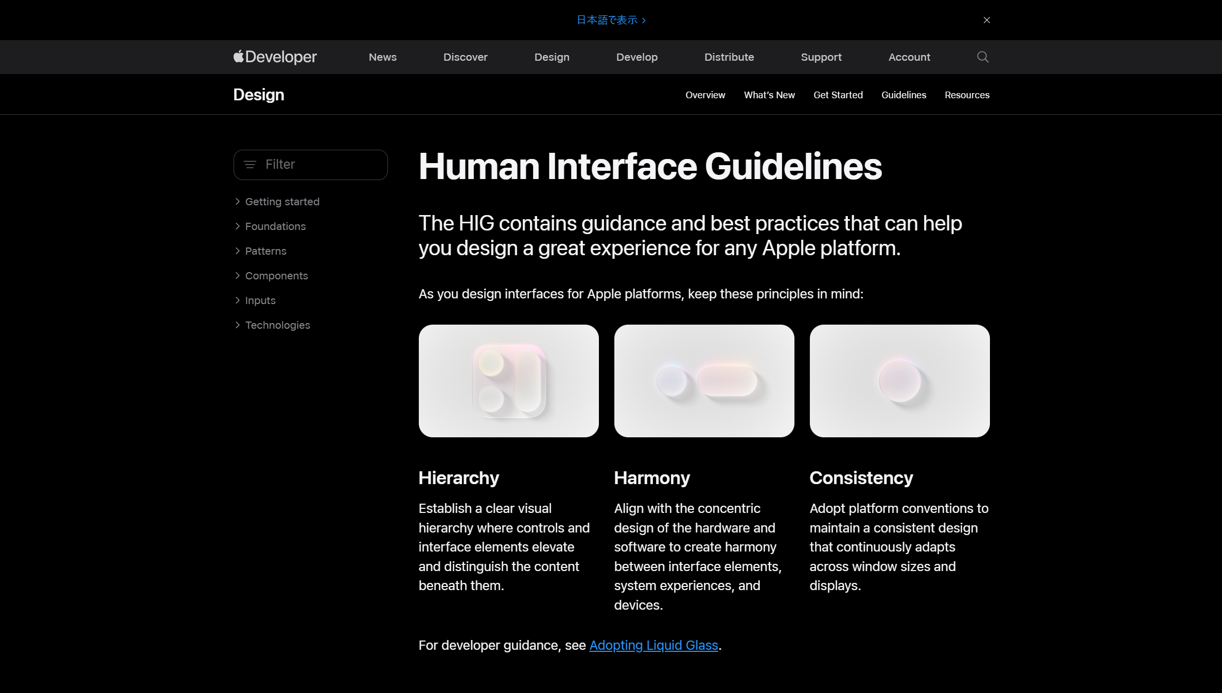 iOSやmacOSなど、Appleのエコシステム全体にわたる卓越したユーザー体験の根幹をなすガイドラインです。個々のUIコンポーネントの仕様だけでなく、「Clarity(明瞭さ)」や「Deference(尊重)」といった、プラットフォームとアプリがシームレスに調和するための普遍的なデザイン原則を提示しているのが特徴です。ユーザーが直感的に操作できる世界観を実現するための哲学が貫かれており、あらゆるデザイナーにとって必読のドキュメントです。
