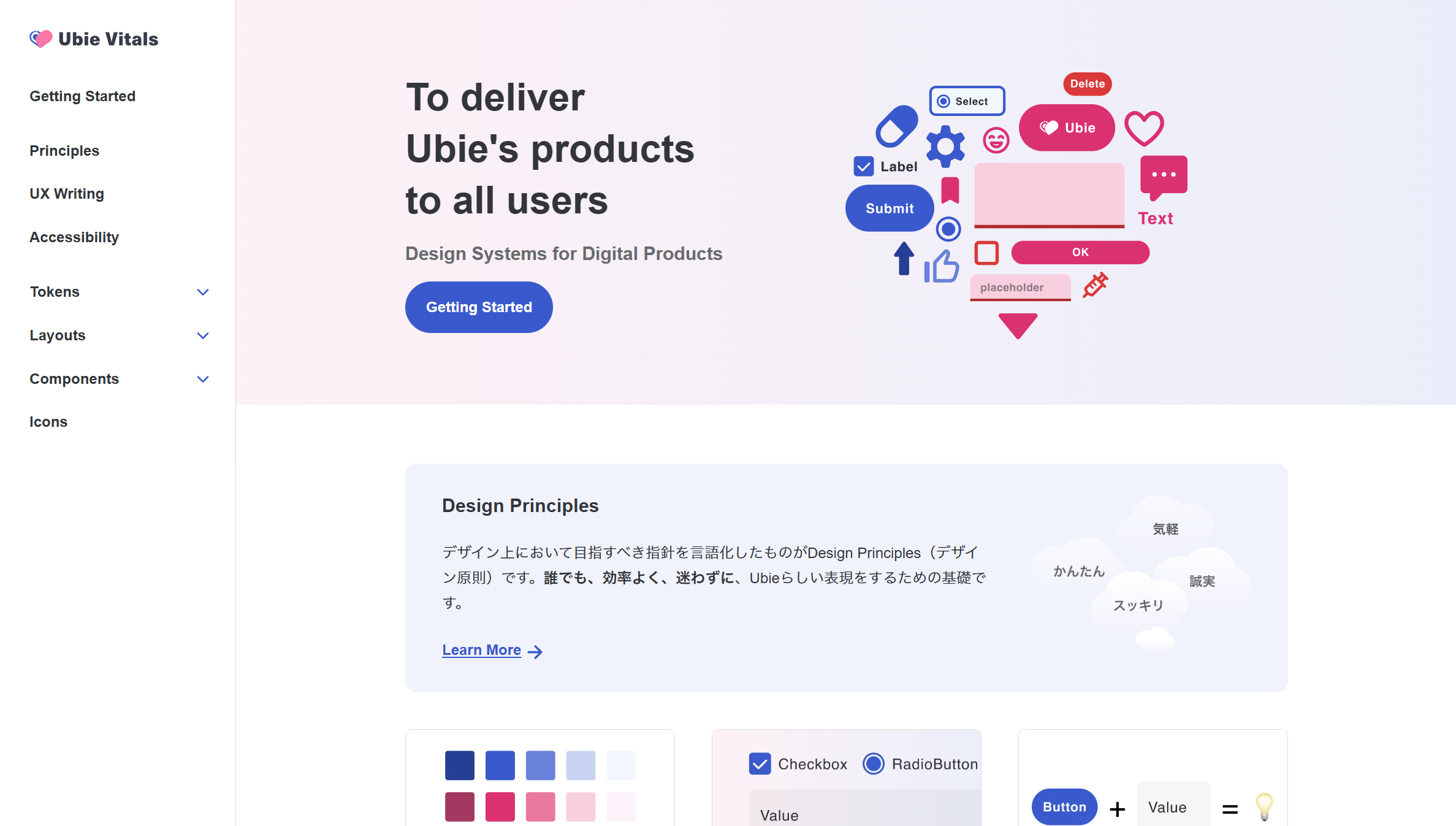 医療プラットフォーム「Ubie」のプロダクトUIのためのデザインシステムです。医療・ヘルスケアというドメインの特性上、デザイン原則として特に「信頼できる」「わかりやすい」ことを最重要視しています。命に関わる情報を扱うからこそ、ユーザーの誤解を防ぎ、絶対的な信頼性を確保するための設計思想が貫かれており、サービスが持つ責任をデザインでどう体現するかの模範例と言えます。