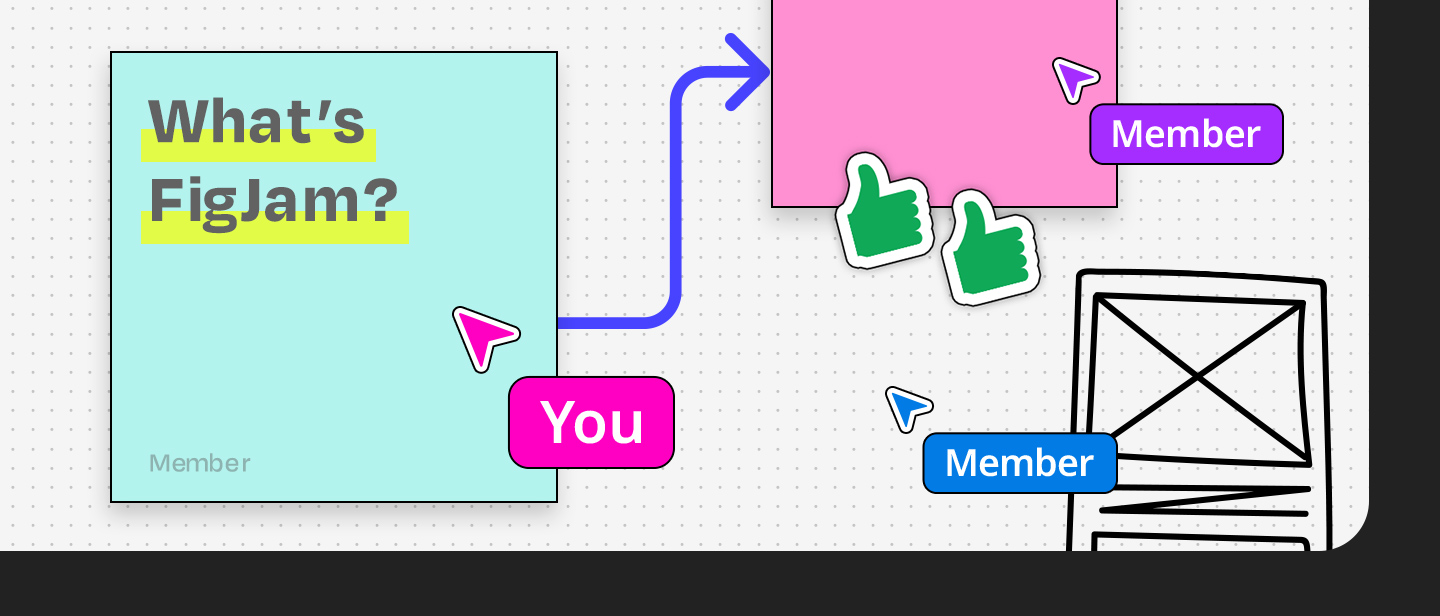 FigJamは、場所を問わずにチームメンバーがリアルタイムで共同作業できるオンラインホワイトボードです。 無限に広がるキャンバス上に、付箋、図形、テキスト、手書きのイラストなどを自由に配置し、アイデアを可視化できます。