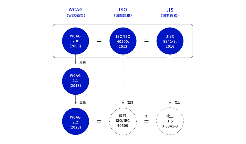 これは、日本のWebサイトのアクセシビリティガイドラインによく用いられるJIS規格も近いうちにアップデートされることを意味しています。