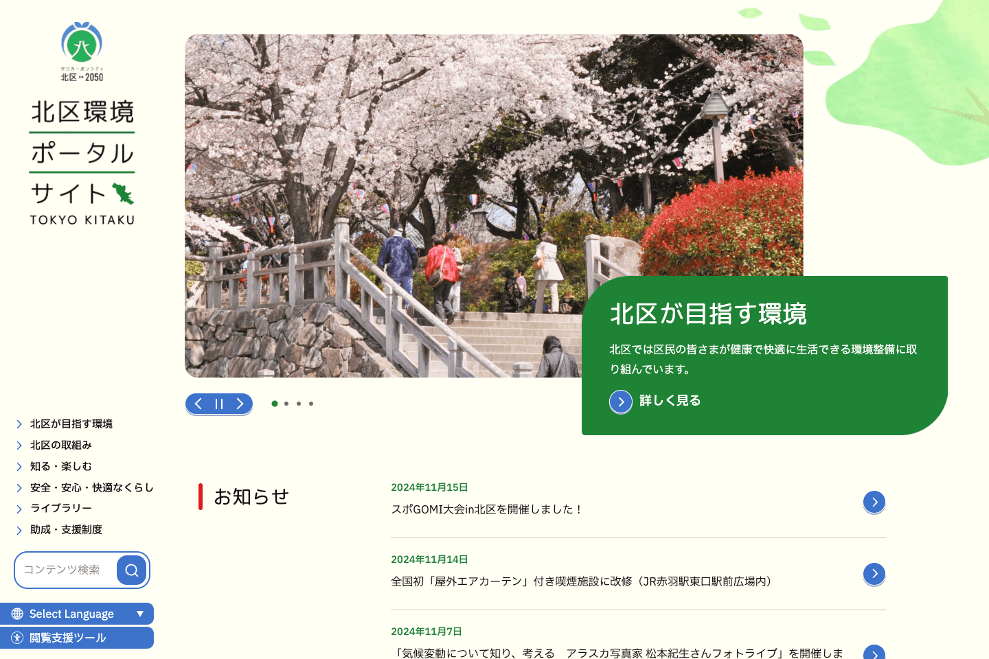 ウェブアクセシビリティにサイト内一貫して配慮し、JIS X 8341-3:2016 適合レベルAA に準拠した、環境ポータルサイトを制作させていただきました。