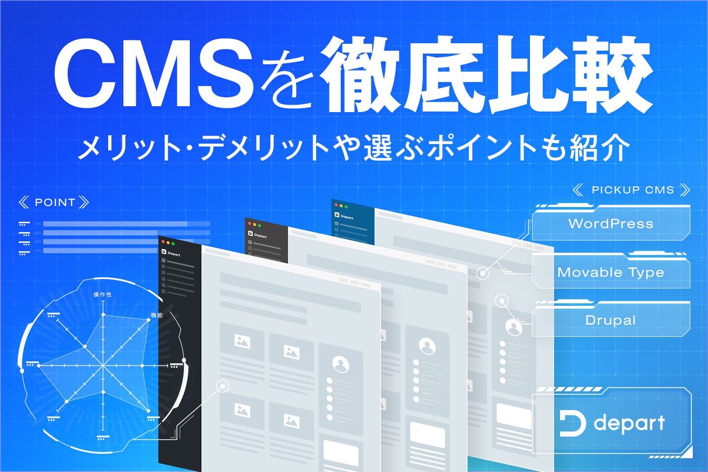 データ設計、SEO対策、ブラウザ評価、運用コスト削減といった機能を担保する実装。